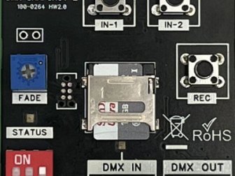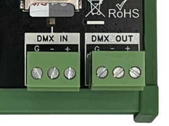 DMX-512 input, with LED. When valid data is present it will pass through to DMX Out, and can be recorded as a snapshot.