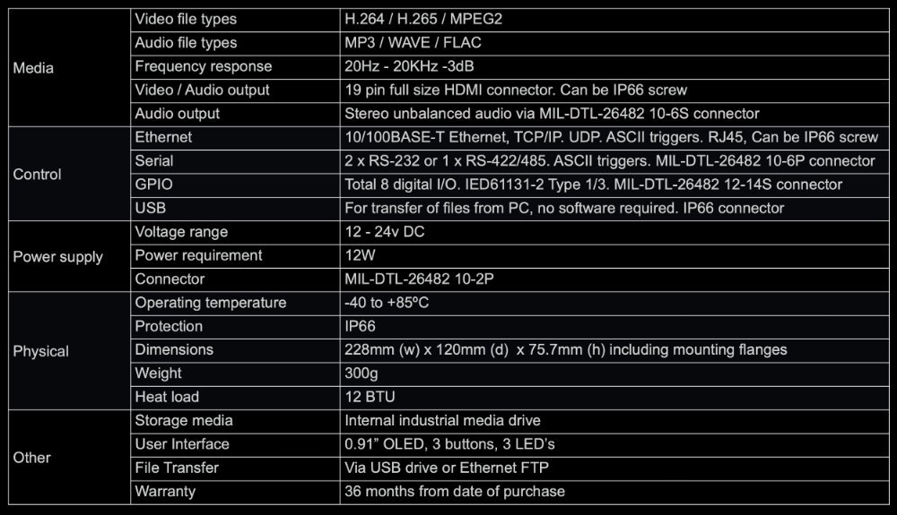 It will replay high bit rate compressed media formats (such as H.264 video and MP3 audio), as well as uncompressed audio wave files up to 16 bit 48KHz. Files can be seamlessly looped, and cued-up for instant start with a seamless cut. Video with embedded audio is output via HDMI, and stereo audio is also output via a line level connector.